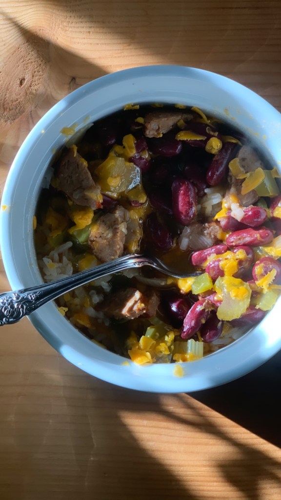 Mulling this over, my marriage to a southern boy has inherently come with a wifely mandate of semi regular red beans and rice. Red beans and rice legit never goes bad in this house. It is consumed and consumed again until it is gone and – who loves it the most? Aria.